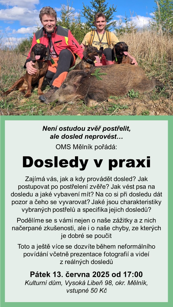 Kynologická komise OMS Litoměřice pořádá v sobotu 16.8.2025 Lesní zkoušky ohařů a ostatních plemen v honitbě MS Český granát Podsedice. Sraz účastníků v 8:00 myslivecké chatě MS Český granát Podsedice, začátek zkoušek v 9:00. Těšíme se na Vaši účast!...